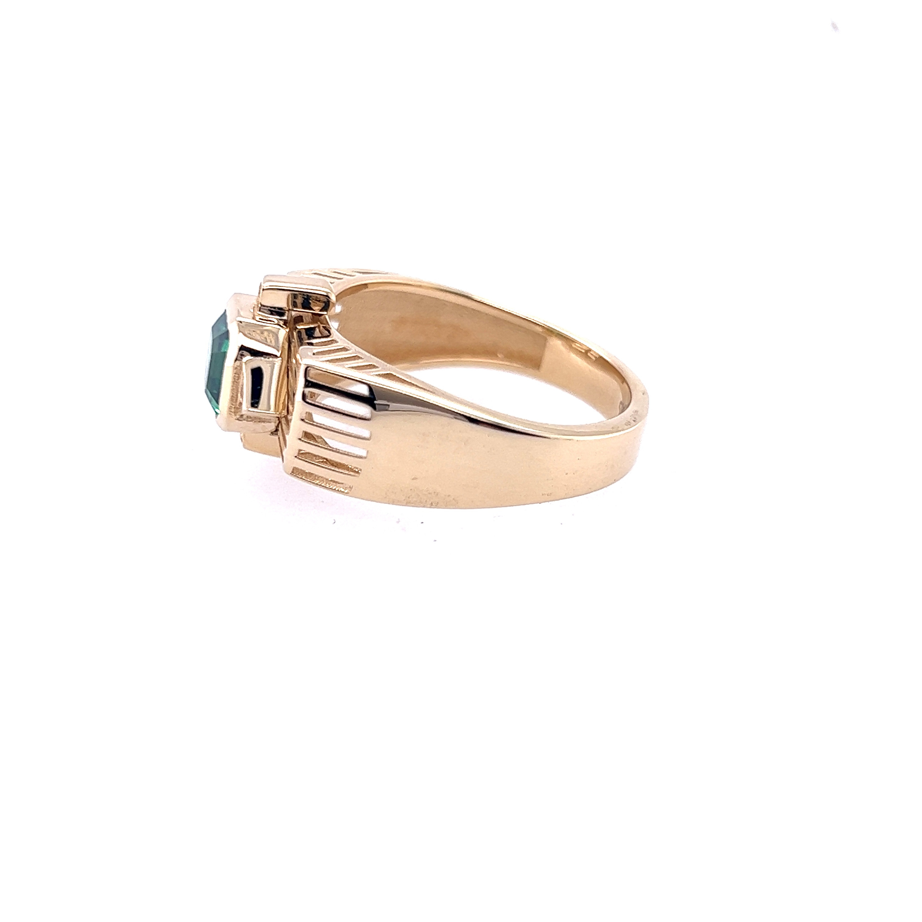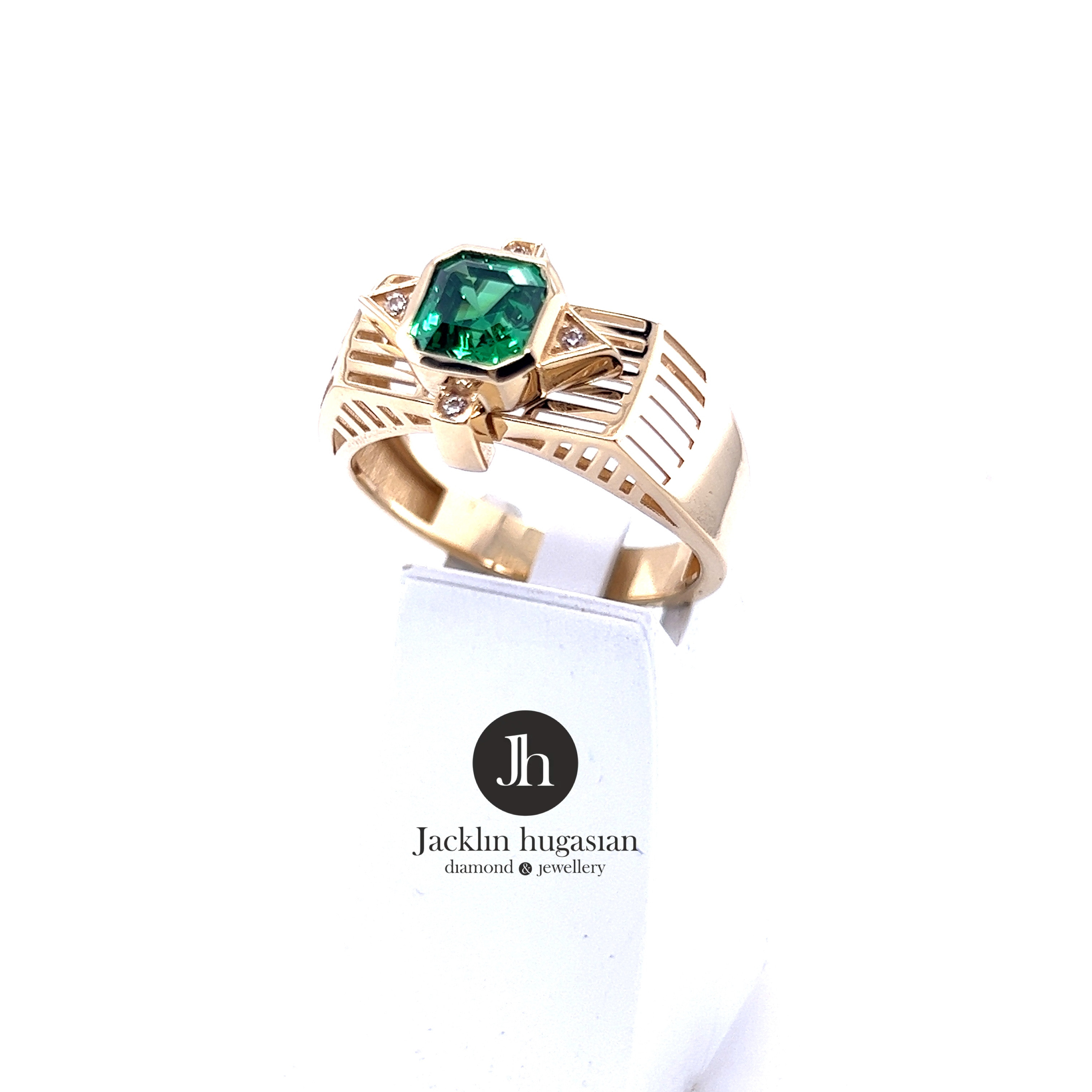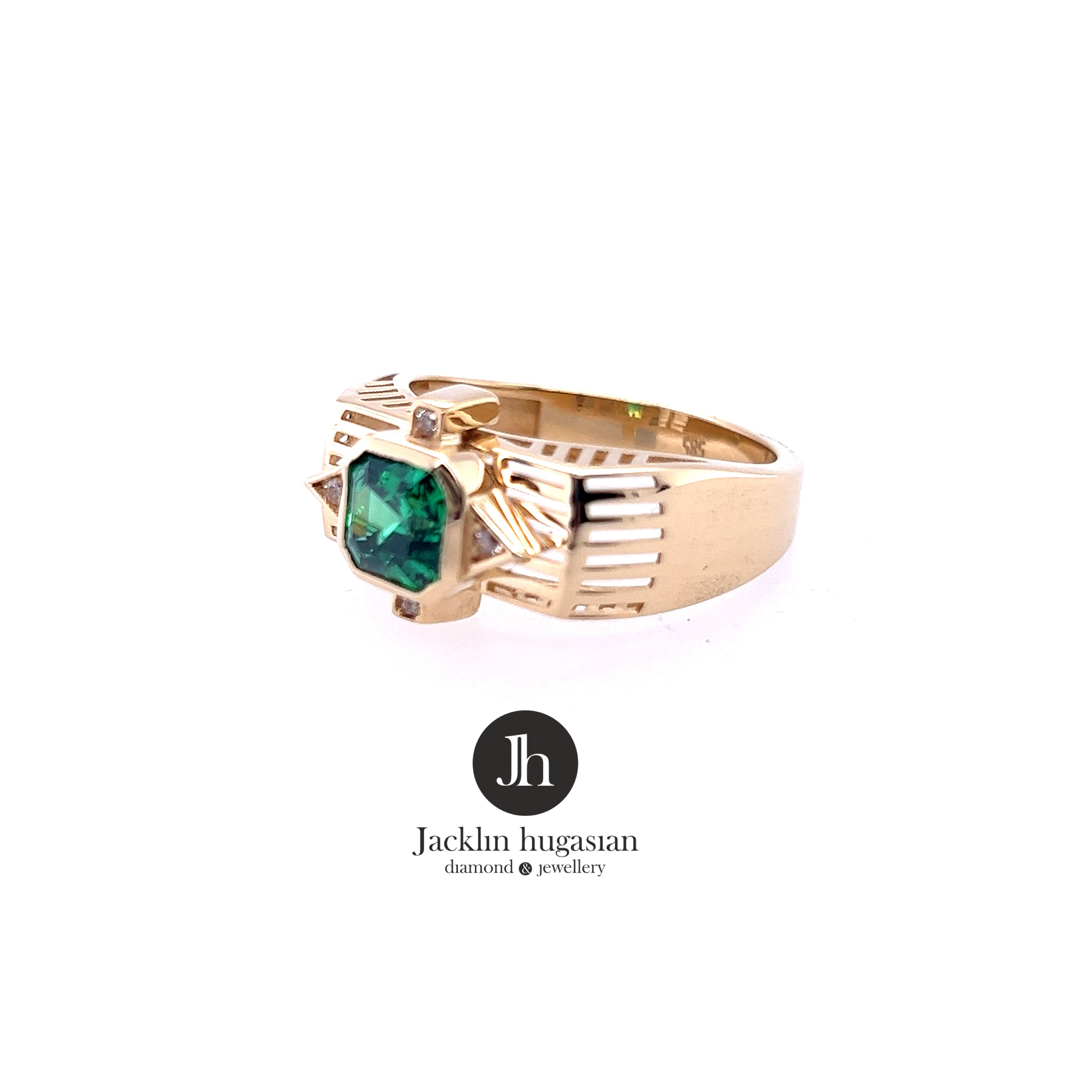 Пръстен от "Jacklin hugasian" в жълто злато с циркони и изумруд.