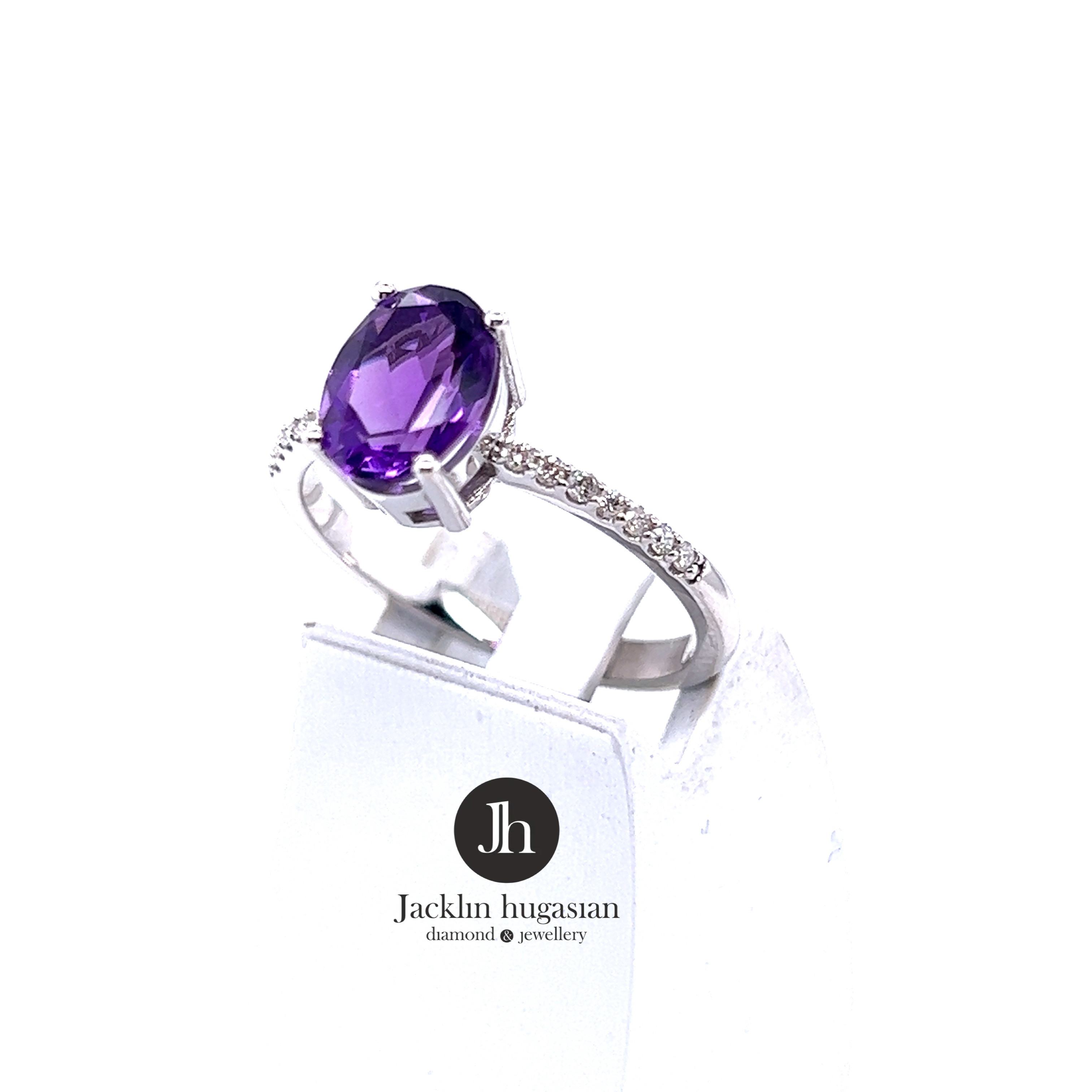 Пръстен от “Jacklin hugasian” в бяло злато с аметист и диаманти.