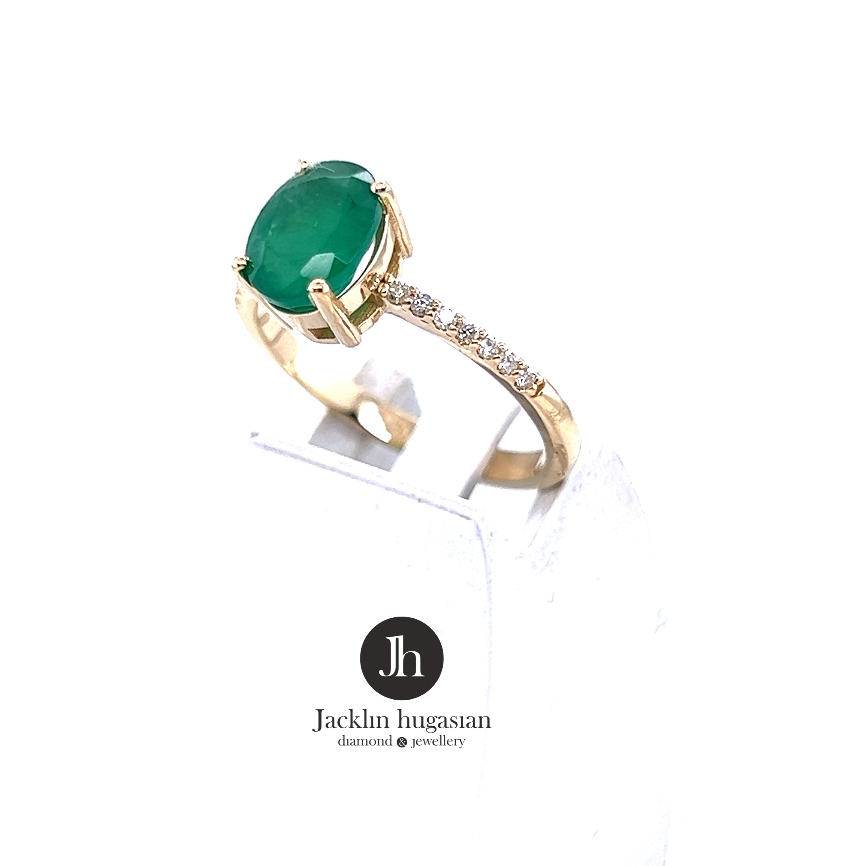 Пръстен от "Jacklin hugasian" в жълто злато с изумруд и диаманти.