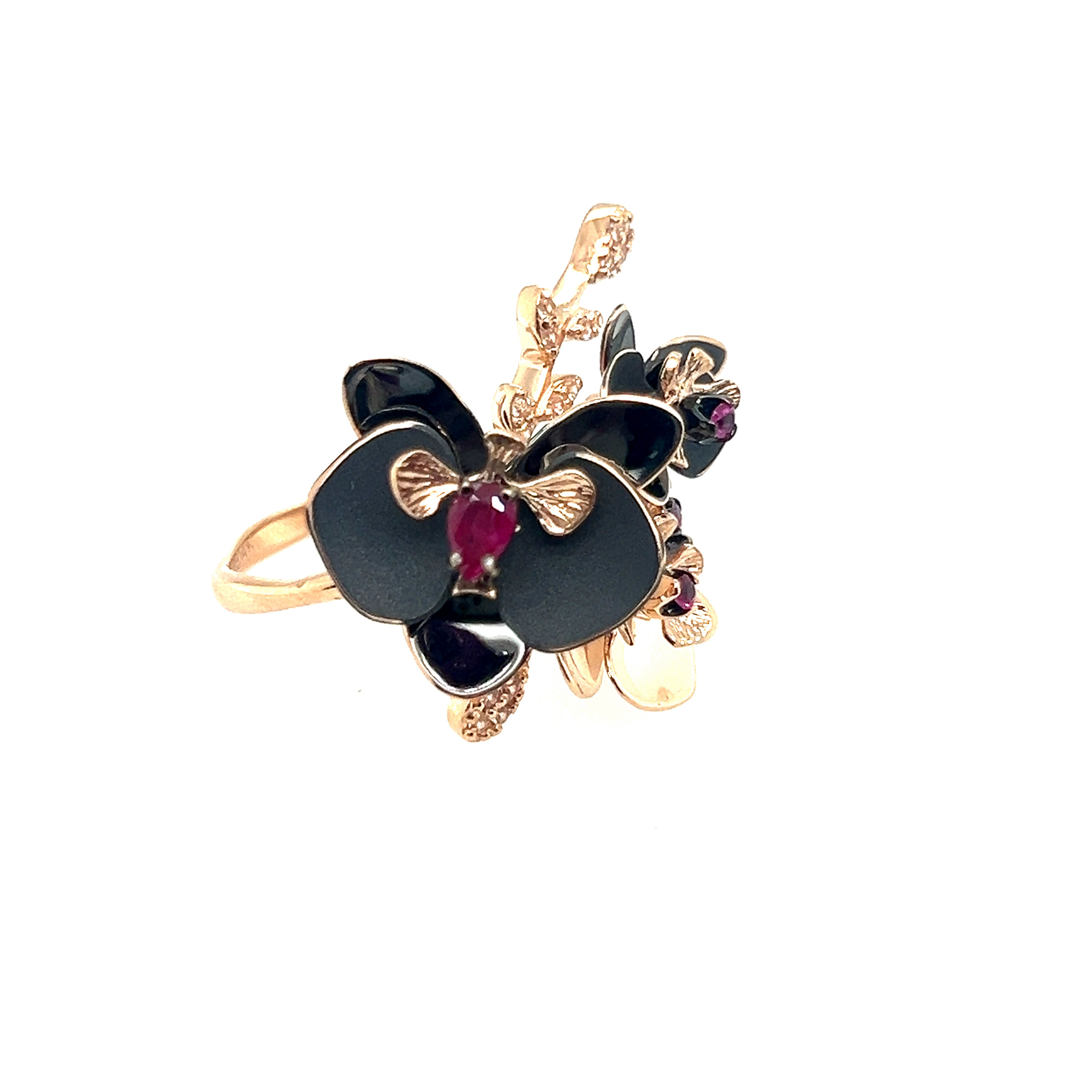 Пръстен от “Jacklin hugasian” в розово и черно злато с рубин.