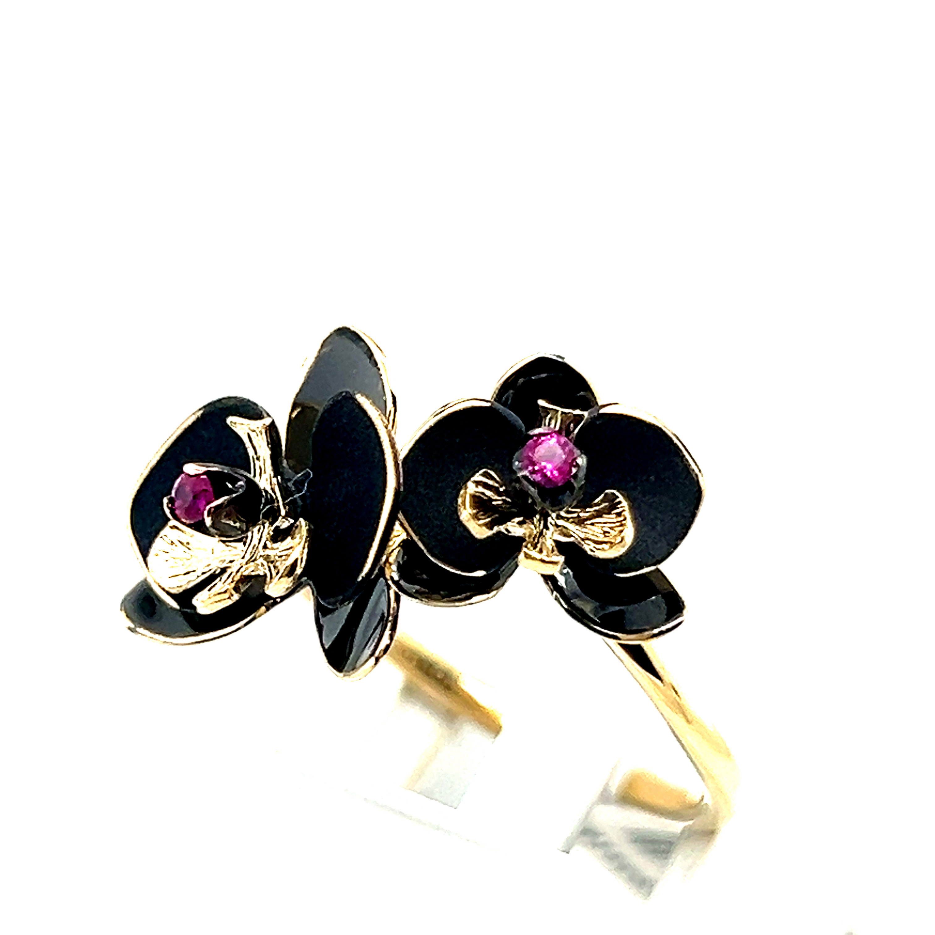 Пръстен от “Jacklin hugasian” в жълто и черно злато с рубин.