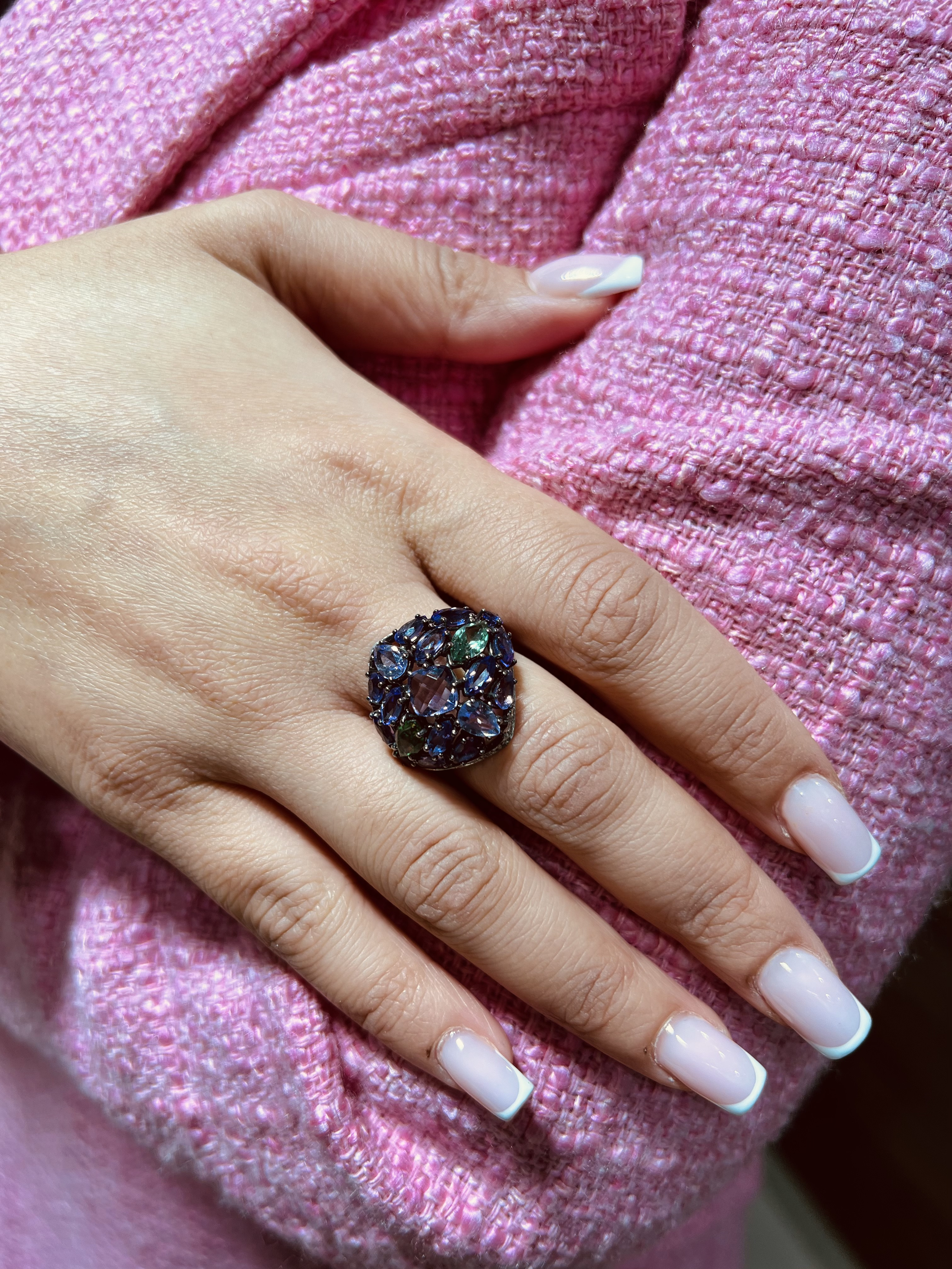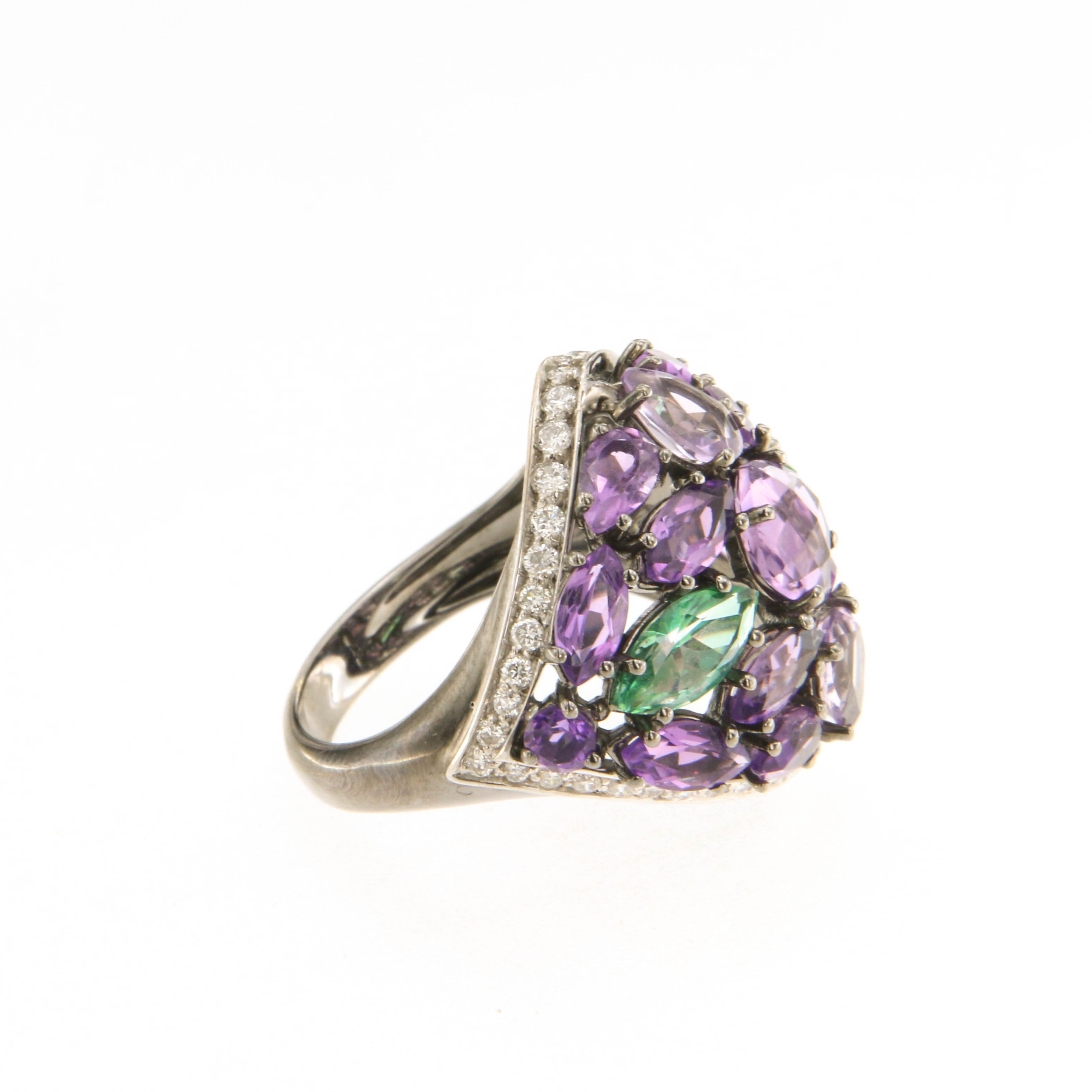 Пръстен от “Jacklin hugasian” черно злато с диаманти, аметист и турмалин. Размер N54.