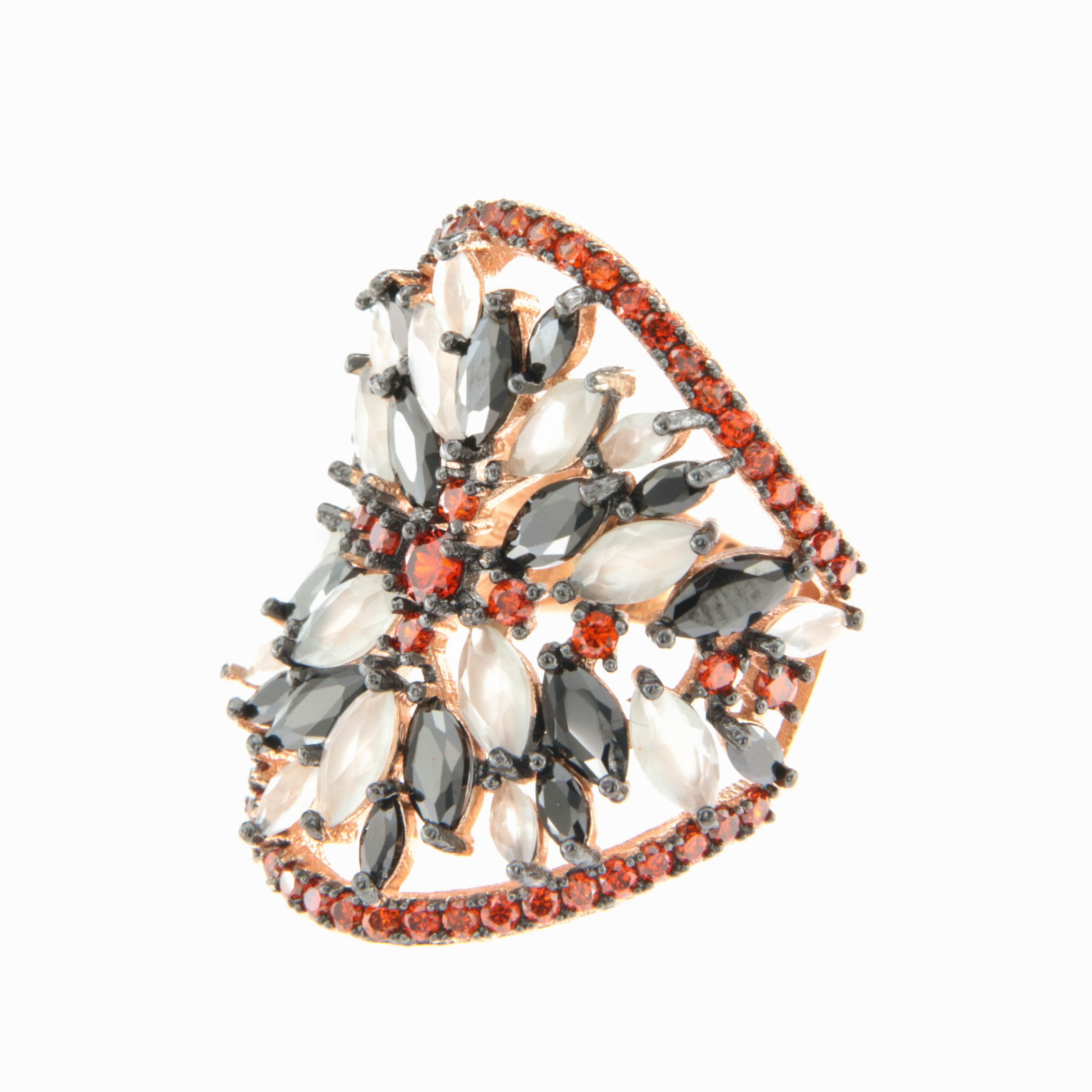 Пръстен от " Jacklin hugasian " розово сребро с лунен камък, оникс и топаз.