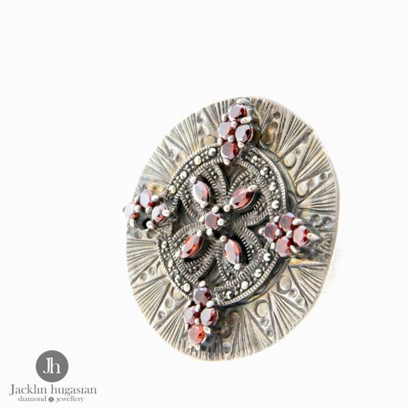 Пръстен от "Jacklin hugasian" в оксидирано сребро с тъмно червен гранат и марказити.