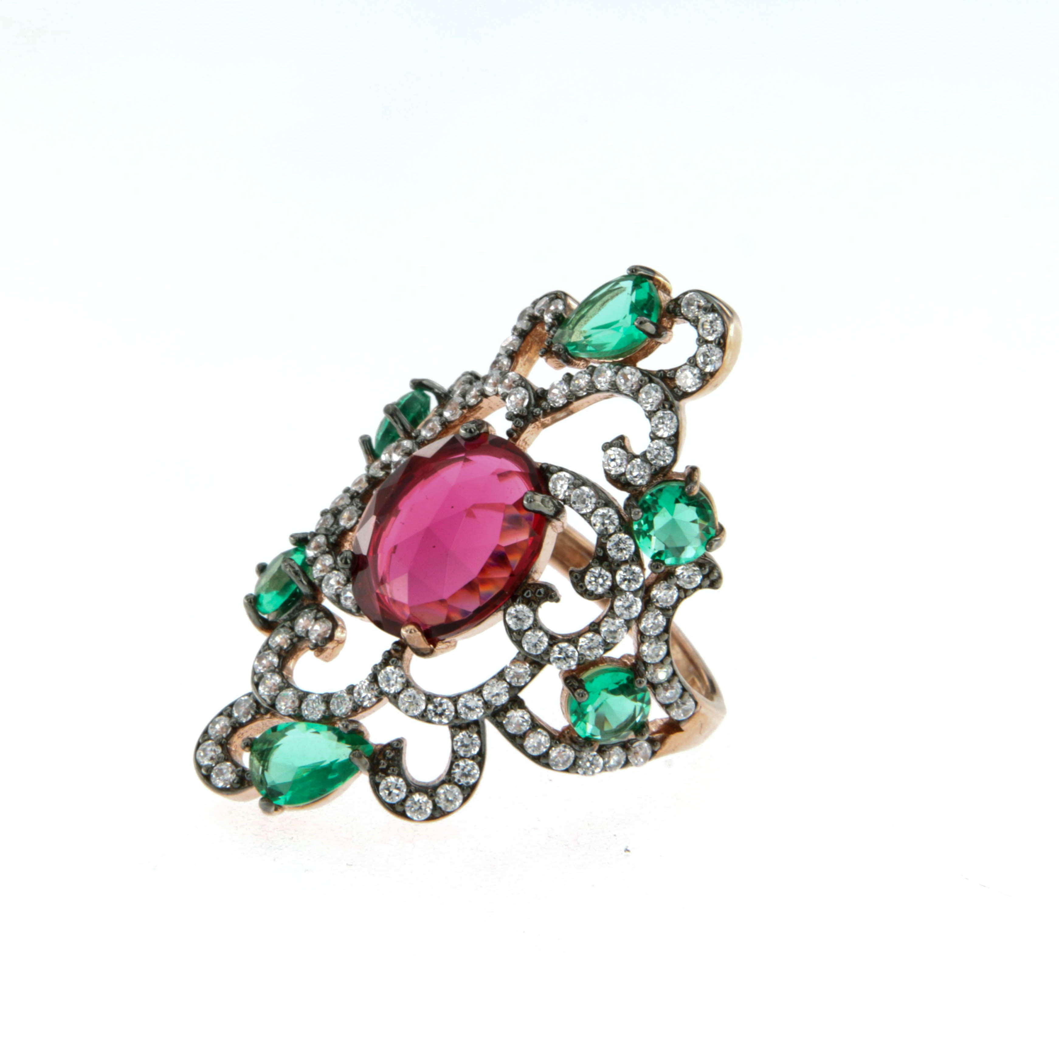 Пръстен от "Jacklin " в розово сребро с цирконии, синтетичен рубин и зелен изумруд