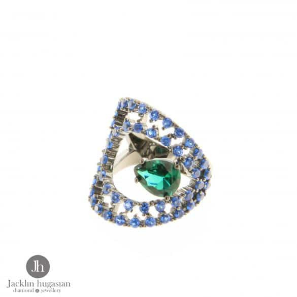 Пръстен от "Jacklin hugasian" в сребро с черен родий, зелен тюрмалин и тъмно син сапфир. Произход Италия.