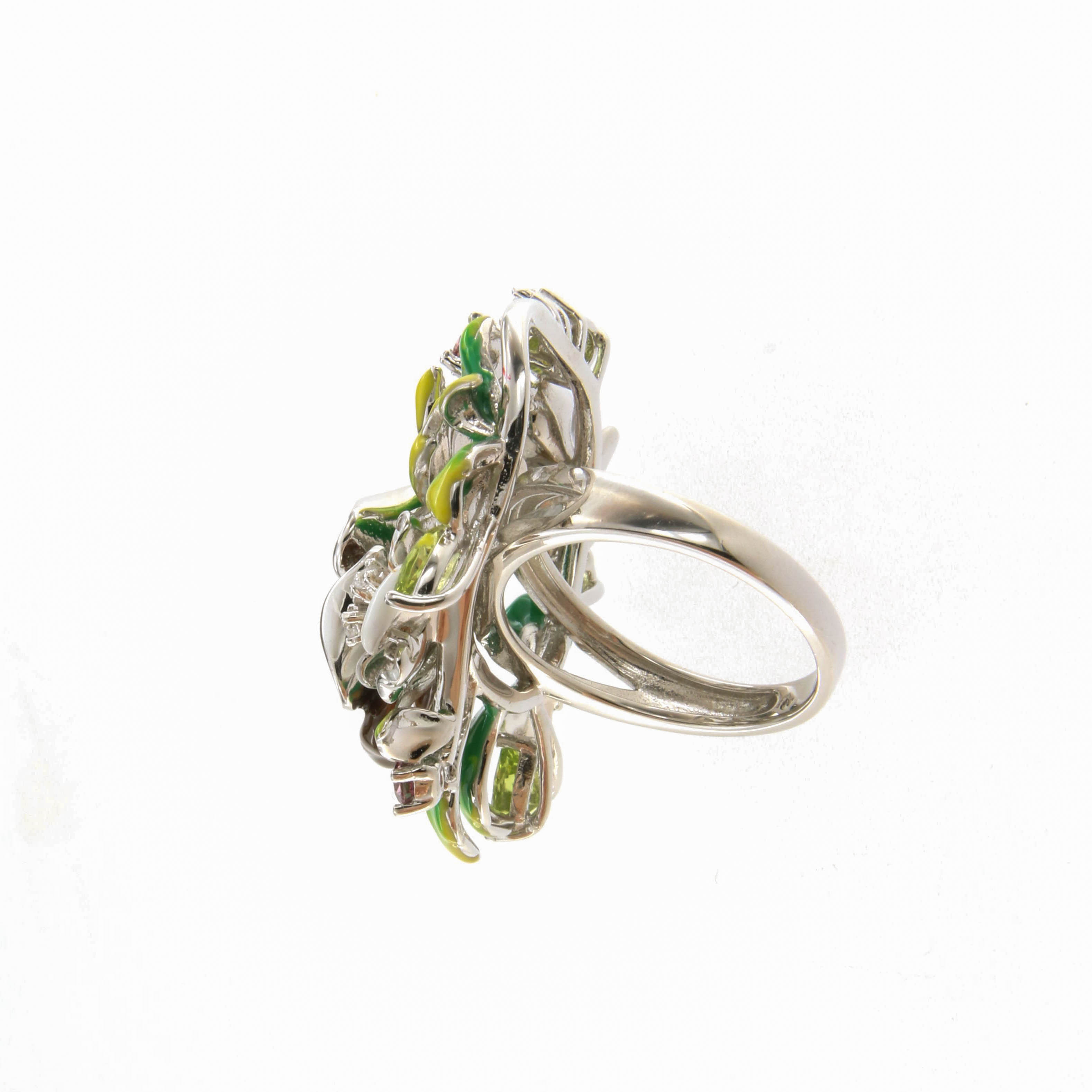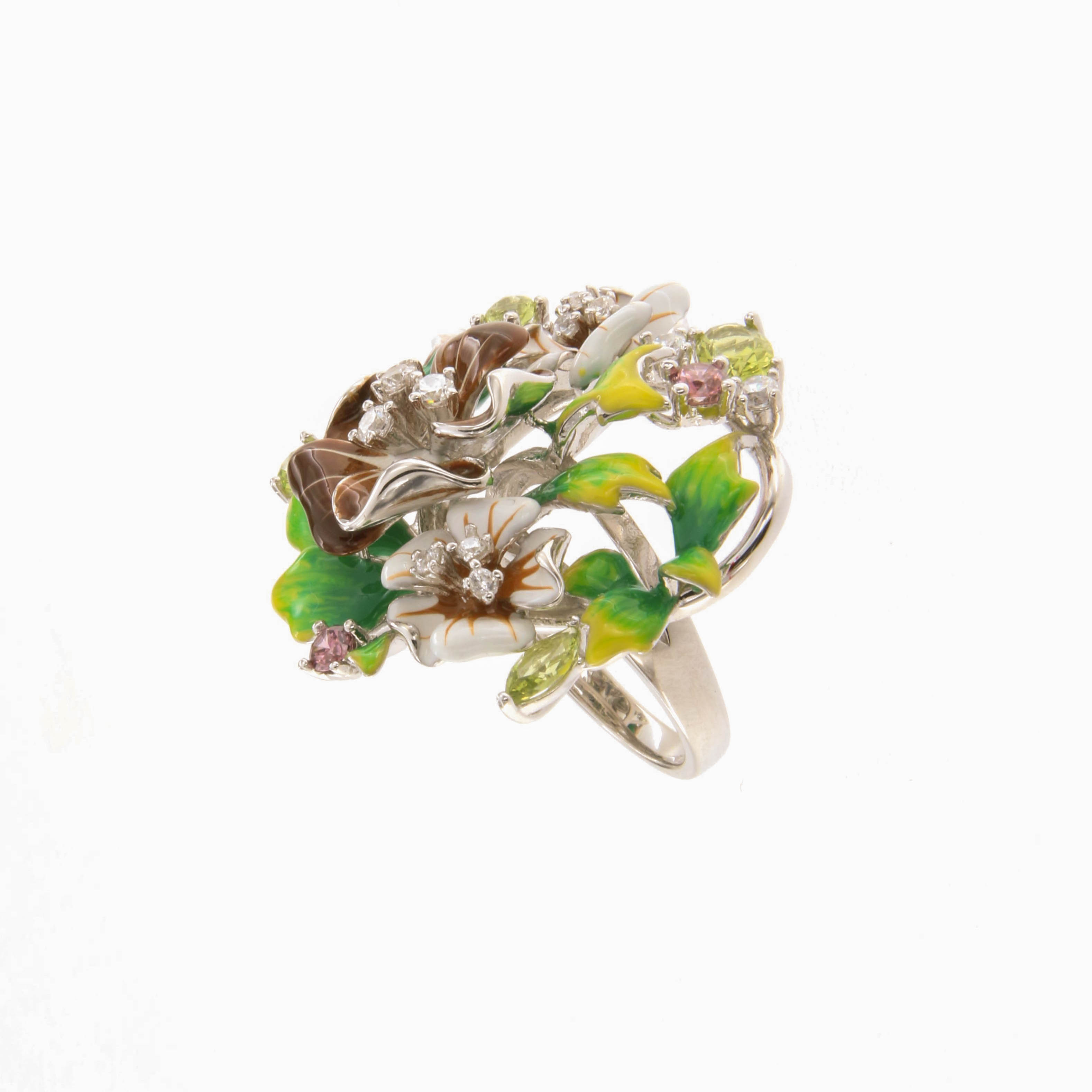 Пръстен от "Jacklin hugasian" в сребро с цветен емайл и циркони, аметист и перидот. Колекция "Roberto Bravo".