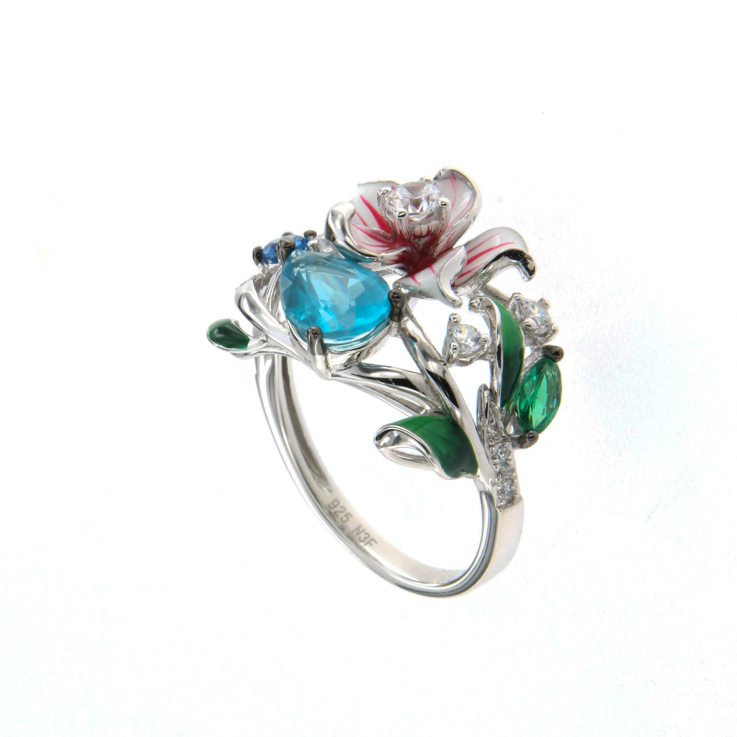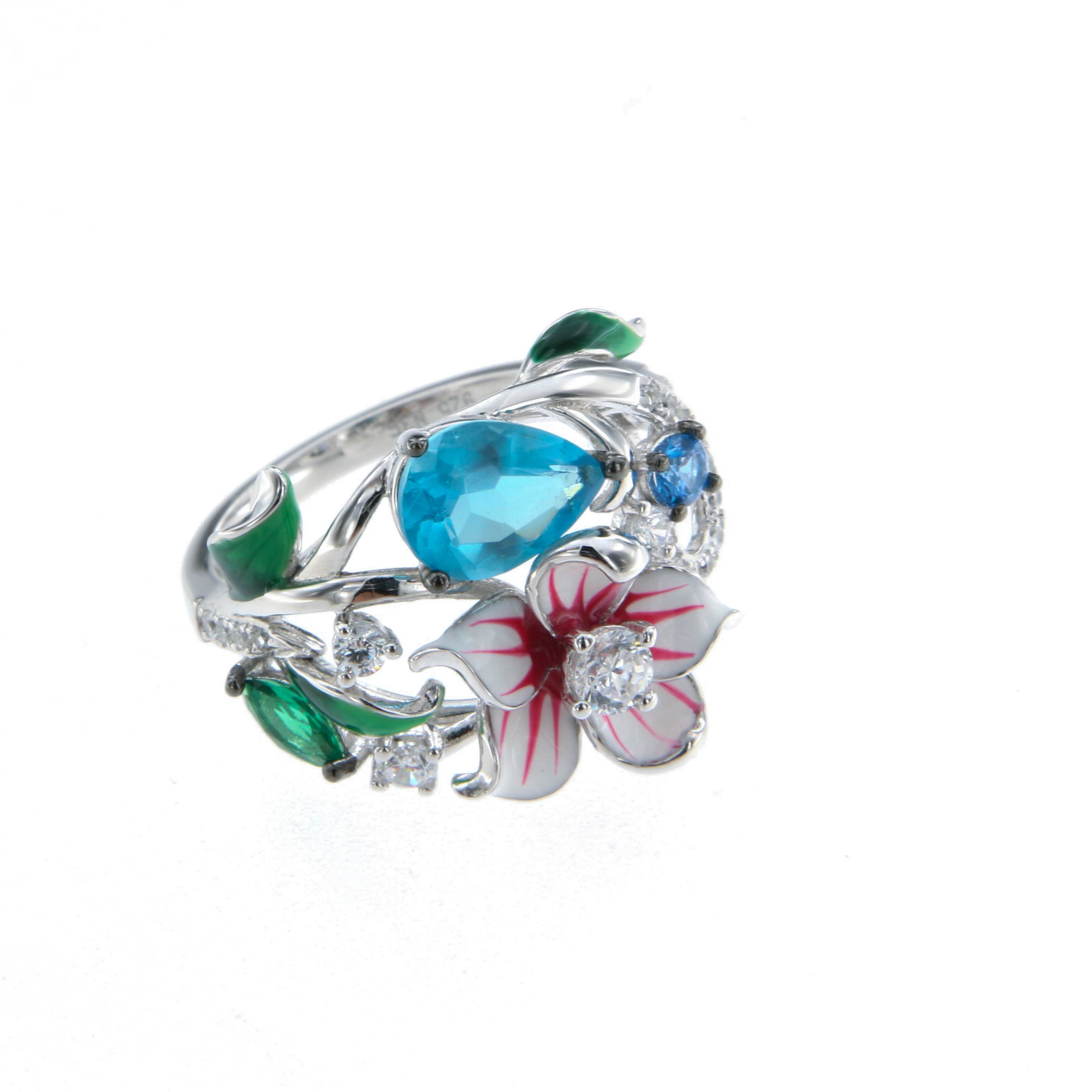 Пръстен от "Jacklin hugasian" в сребро с разноцветен емайл с аквамарин, сапфир и циркони. Колекция "Roberto Bravo".
