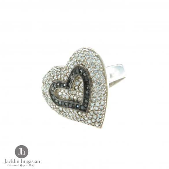 Пръстен "Сърце" от "Jacklin hugasian" в сребро с цирконии и черни оникси.