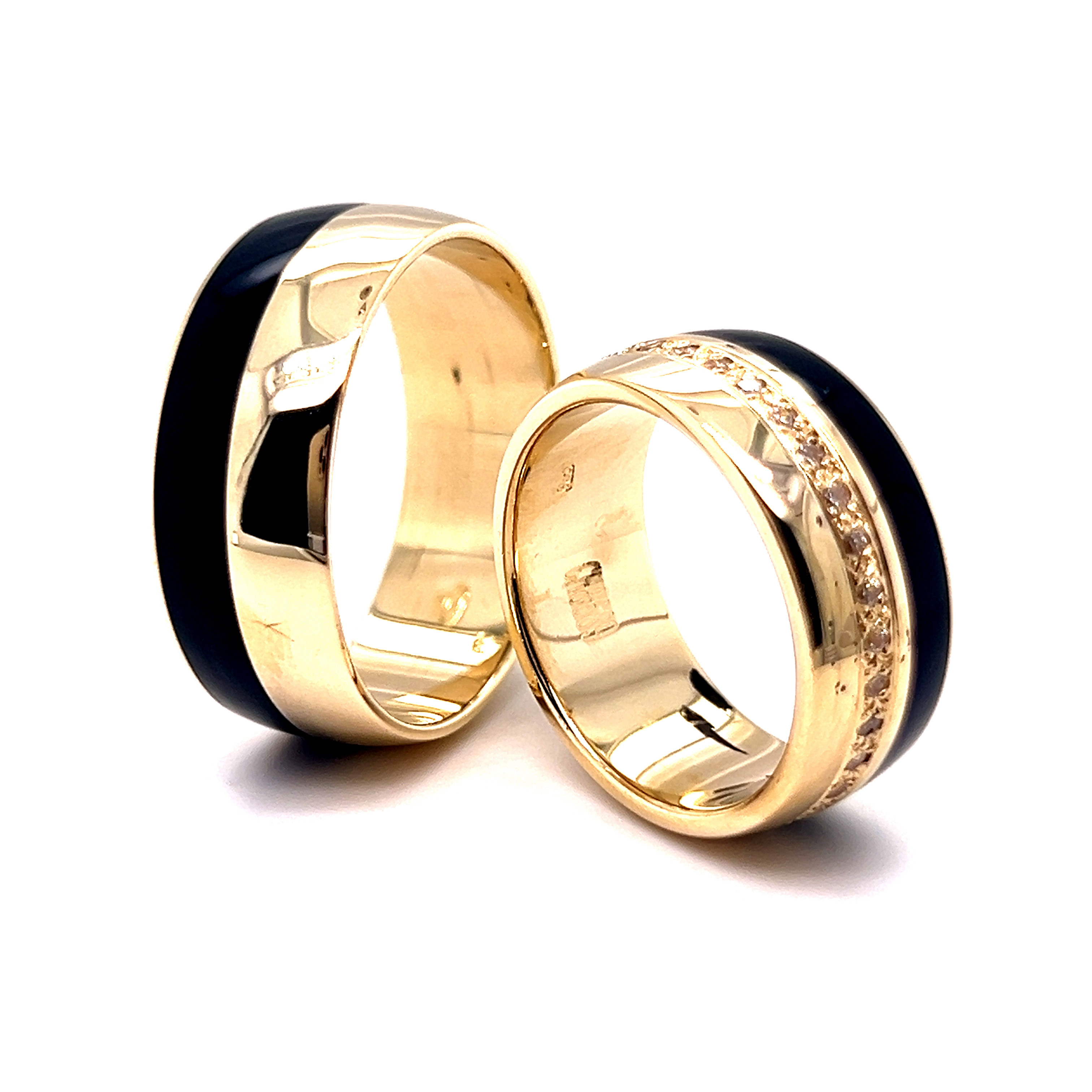 Венчални халки от "Jacklin hugasian" жълто злато с цирконии и оникс - гланц.