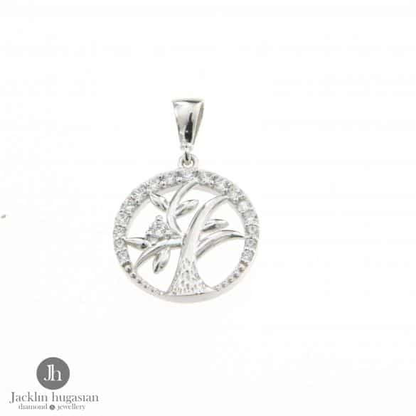 Висулка " Дърво на живота " от " Jacklin hugasian " в бяло злато,гланц с цирконии.Дължина висулка 1.6 см. , широчина 1.4 см.