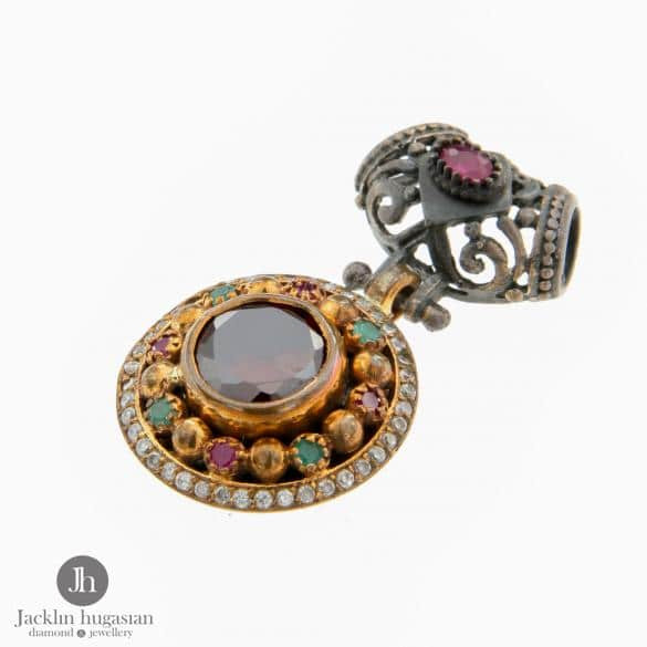 Висулка от "Jacklin hugasian" оксидирано сребро с позлата и изумруд, рубин и цирконии. Дължина висулка 4.0 см., широчина 2.4 см. Колекция " SULTAN ".