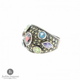 Пръстен от "Jacklin " в оксидирано сребро с лилав аметист, марказити, аквамарин, тъмно червен гранат и перидот